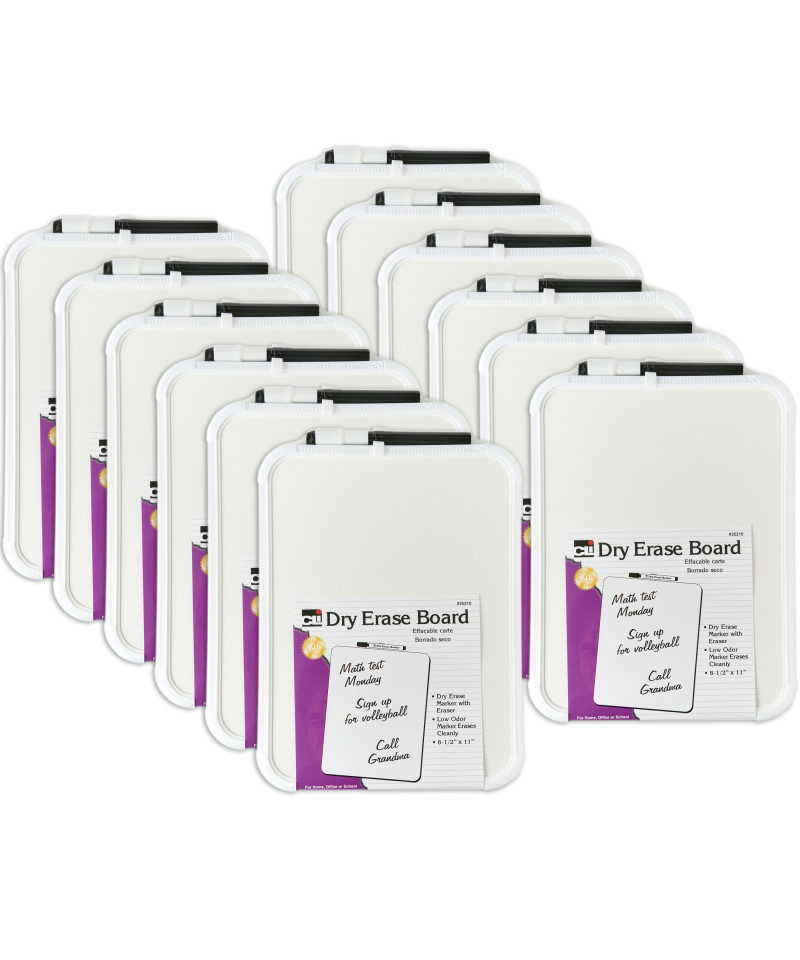Dry erase board comes with a sturdy frame in white, and a dry-erase marker with eraser. Dry Erase board measures 8-1/2" x 11. Marker is non-toxic and conforms to ASTM D4236. Each set includes 12 boards, each board includes a marker with eraser.
