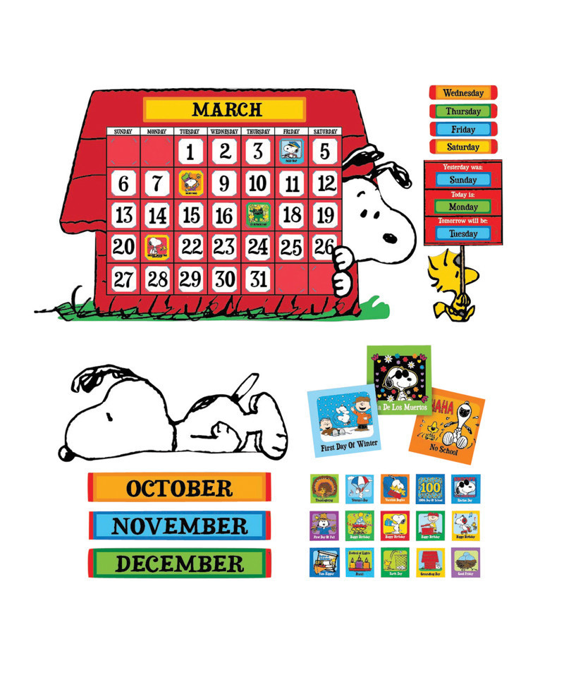 Eureka Bulletin Board Sets are sure to bring any room to life. With the brightest colors, individual designs and variety of styles, the choices are endless. Everything needed to create a giant classroom calendar, with month headings, dates and additional squares containing illustrations that highlight special days. The Peanuts gang can be part of your classroom with this fun calendar set that incorporates two different Snoopy poses. 112 Piece Set Includes 1 Giant Calendar (34" x 24").