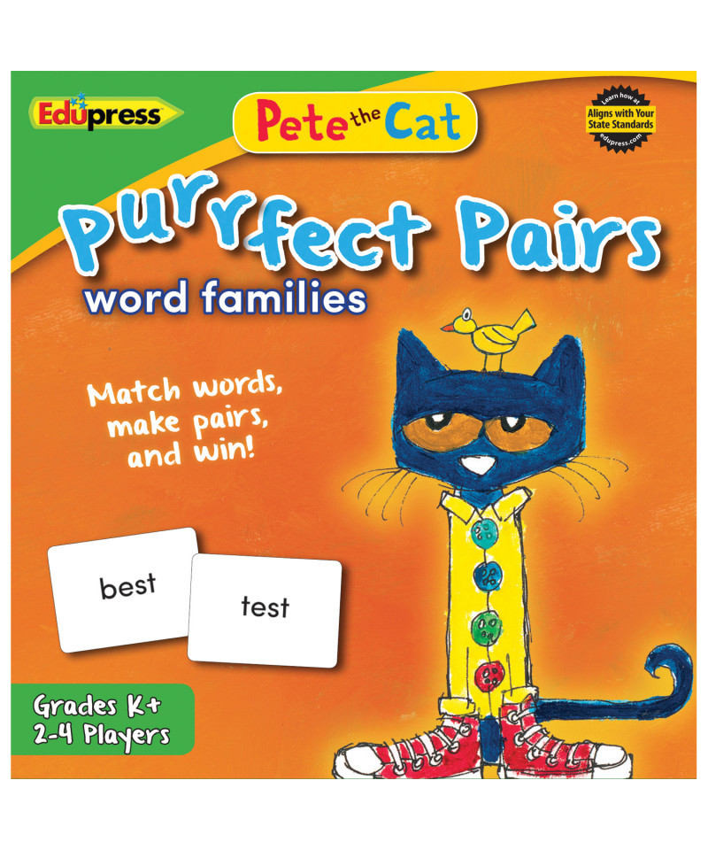 Practice pairing words by word family in this purrfectly fun game! Players take turns drawing from the deck of word cards and matching them with the cards in front of them. The first player to make four matching pairs wins the game. The game is separated into three color-coded decks to optimize gameplay for 2-4 players. The game includes 150 cards, offering players practice with 24 word families. Directions with additional activities included. Ages 5+