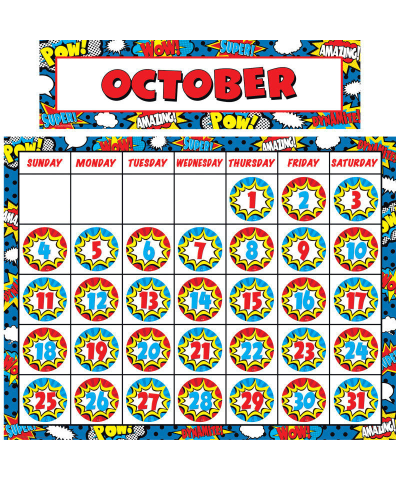 Superhero Calendar Set: This set consists of 12 headliners. Each headliner measures 5" x 18". A chart that measures 17" by 22". Related lessons and activities are provided on the back. Calendar Days that are about 2.5 inches. 36 total cards, including Cards 1-31, a 23/30 card, a 24/31 card, and 3 blank cards. Convenient, useful learning tools that decorate as they educate!