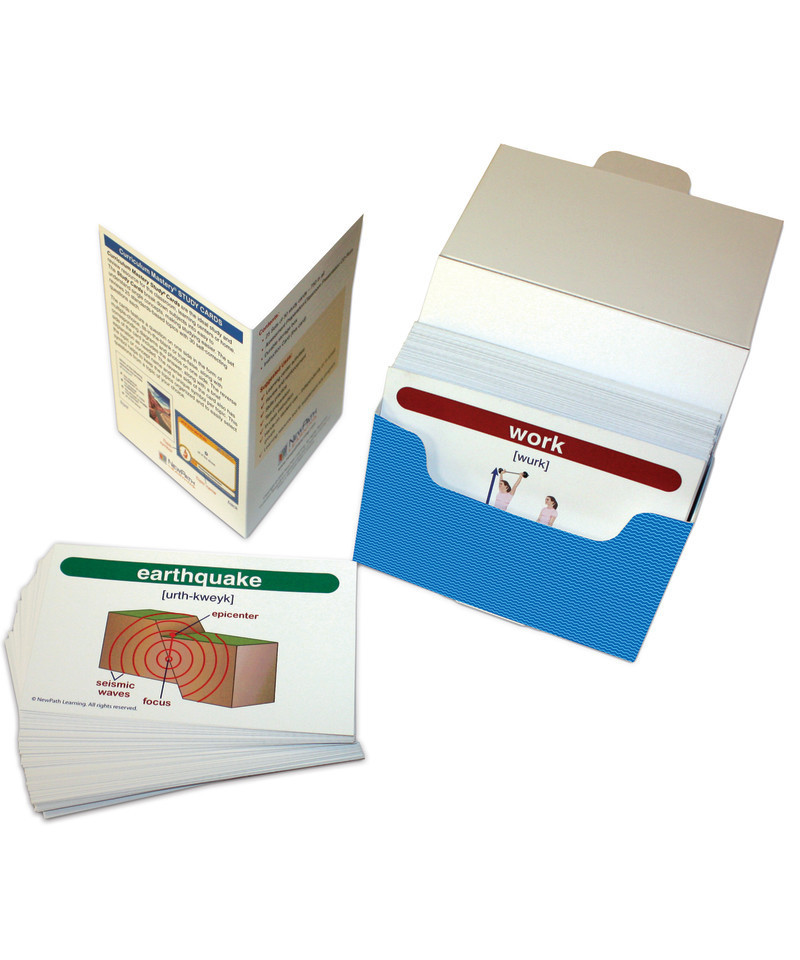 NewPath's Science Vocabulary Builder flash card sets provide comprehensive coverage of the key terms in the Disciplinary Core Ideas of the Next Science Generation Standards and current state standards. Colorfully illustrated, the cards can be used to conduct a variety of engaging activities and games which foster lasting understanding of key concepts. Includes 200 Flash Cards- colorfully illustrated and printed on 4" x 5-1/2" heavy stock — teacher resource guide with suggested activities and a trial subscription to NewPath's Online Learning Program. Each card features the term, its pronunciation and a graphic depiction on one side and the term's definition on the reverse.