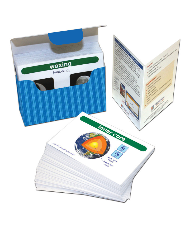 NewPath's Science Vocabulary Builder flash card sets provide comprehensive coverage of the key terms in the Disciplinary Core Ideas of the Next Science Generation Standards and current state standards. Colorfully illustrated, the cards can be used to conduct a variety of engaging activities and games which foster lasting understanding of key concepts. Includes 200 Flash Cards- colorfully illustrated and printed on 4" x 5-1/2" heavy stock — teacher resource guide with suggested activities and a trial subscription to NewPath's Online Learning Program. Each card features the term, its pronunciation and a graphic depiction on one side and the term's definition on the reverse.