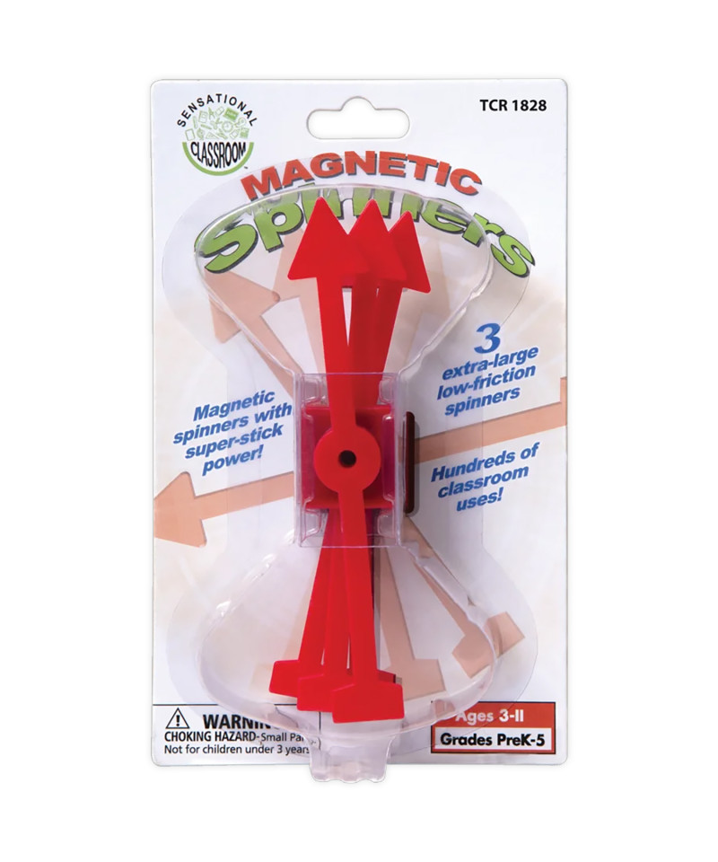 Want to play some spinner games with the whole class or small groups? These three 5" jumbo spinners have strong magnetic bases, making them ideal for creating spinner games on a magnetic white board. Choose players with a spin. Choose any information to start the game with a quick spin at the board. Works great on any magnetically receptive surface. Each pack includes 3 spinners.