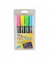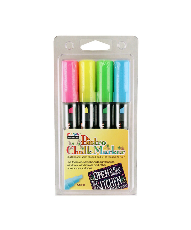 Use Bistro Chalk Markers on chalkboards, light boards, windows, windshields, and most non-porous surfaces. A wonderful way to create chalkboard art to attract attention and increase sales. They are opaque, water based, pigmented, erasable with a damp cloth. Each pack includes 4 markers with a chisel tip: fluorescent pink, fluorescent blue, fluorescent green, and fluorescent yellow.