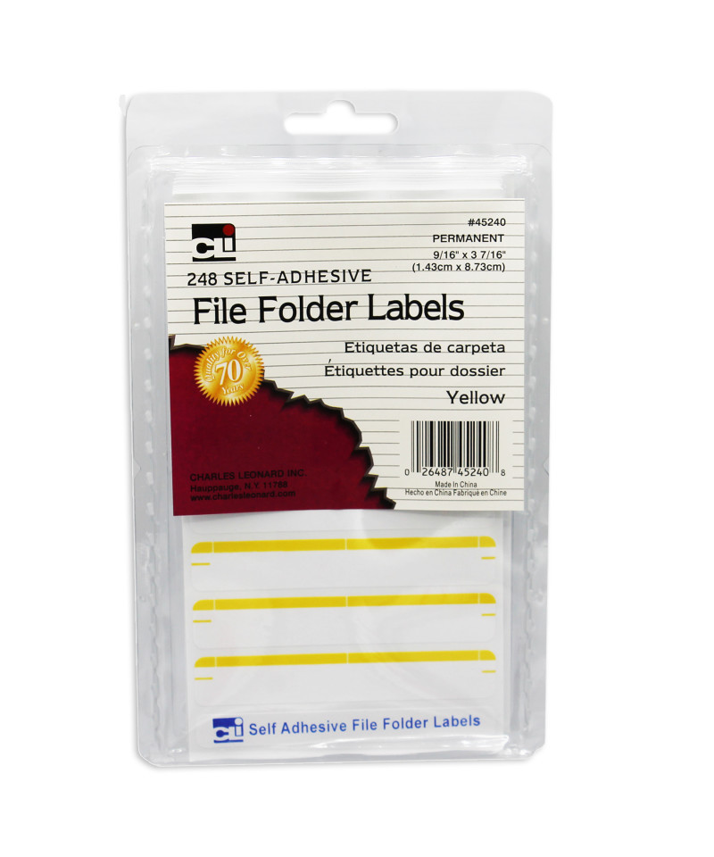 Self-sticking yellow labels feature permanent adhesive. Great for Color coding and organizing files. Labels measure 9/16" x 3-7/16". Each pack includes 248 self-adhesive labels.