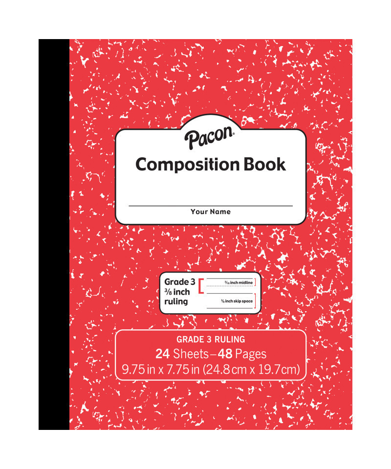 Red marble composition book with a durable soft cover and 24 sheets to meet your needs. Primary grade 3, and ruled 3/8" x 3/16" x 3/16". Great for note taking and journaling. Recyclable. Measures 9.75" x 7.75".