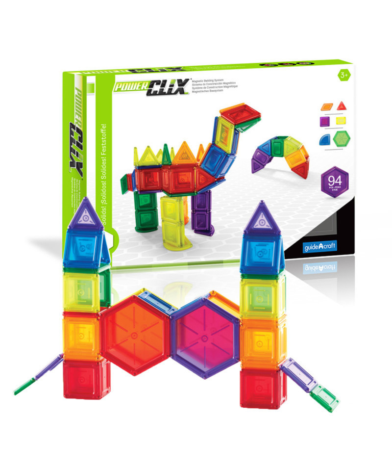 PowerClix® Solids have colorful, solid translucent plastics and geometric shapes that allow for open-ended, creativity-inspiring constructions. In keeping with STEM toy attributes, PowerClix® magnetic building toys encourage children to think like engineers while having fun. Created for the younger boys and girls, both 2D and 3D forms may be built by distilling the structures down to simple solid geometric shapes, furthering their understanding of how mass and volume are used to model an object. Solids are designed to integrate flawlessly with all PowerClix® system sets.
