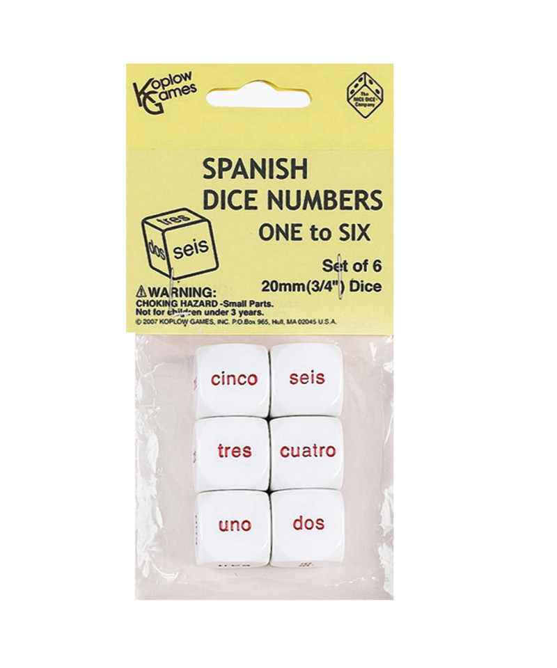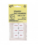 Six-sided Spanish Number Dice. Number recognition from 1-6 / uno-seis. Set of 6.