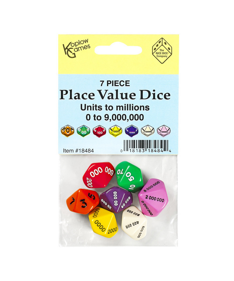 Great tool for practicing place value up to 1 million! Set of (7) ten-sided dice including 1's, 10's, 100's, 1,000's, 10,000's, 100,000's and 1,000,000's.