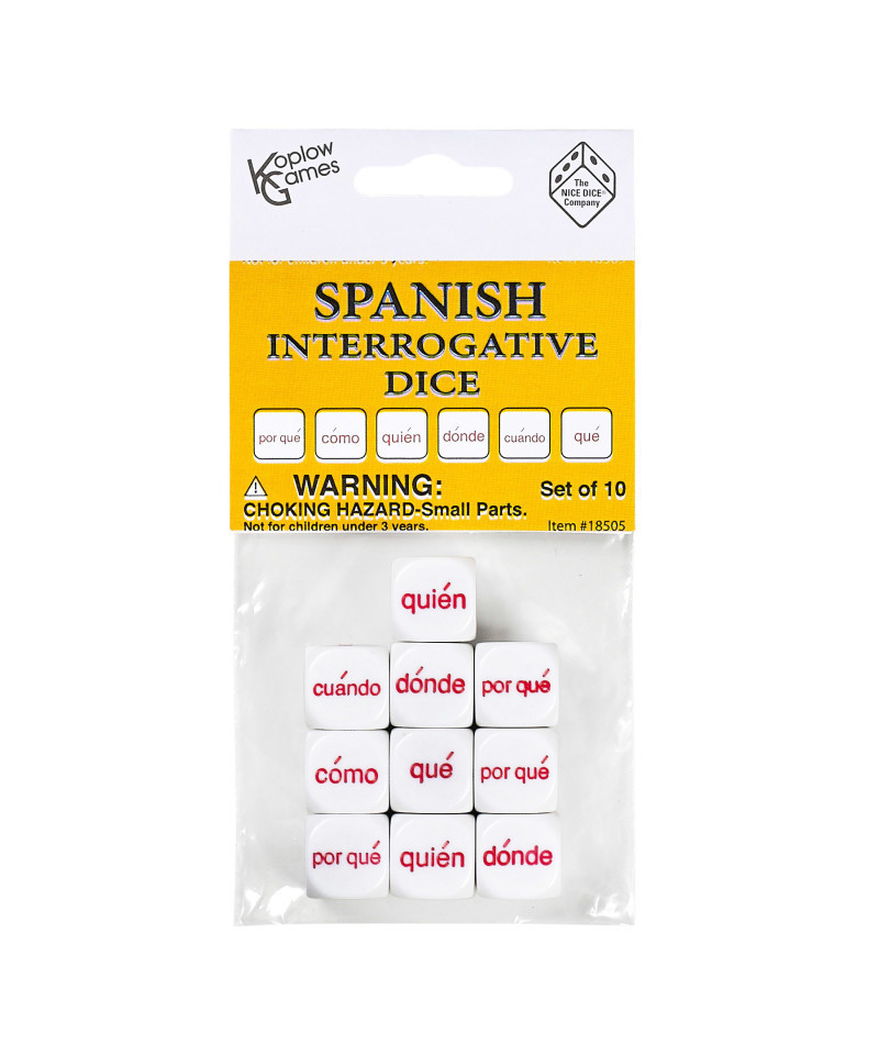 Language arts manipulative in Spanish! Interrogative dice includes por que', como, quien, donde, cuando and que. Set of (10) six-sided dice.