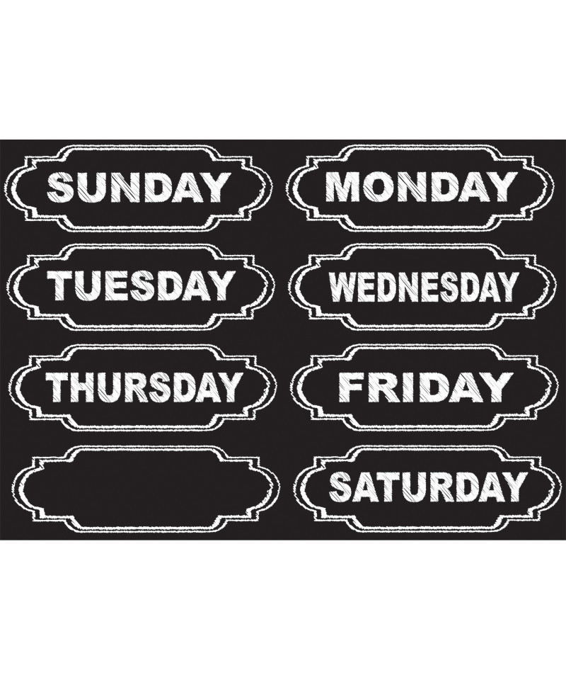 Organize your classroom or home with our magnetic chalkboard style column headers. These pre-printed time savers feature Days of the Week for DIY calendars on magnetic surfaces. Use blank frame to make your own title with liquid chalk markers for best results. Each pack includes 8 die-cut pieces that easily punch out from an 8.5" x 11" sheet. Each piece measures approximately 5.625" x 1.875".
