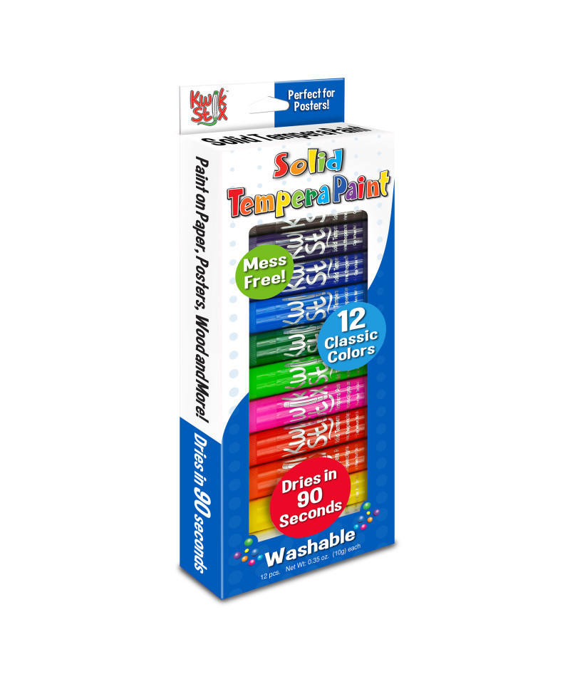 Tired of the endless mess of painting? Fear not! Kwik Stix Solid Tempera Paint sticks take the mess out of painting while keeping all the fun! Simply uncap, twist, and paint! Kwik Stix have a fast drying formula that allow them to dry in 90 seconds while still leaving a paint-like finish! No cups, smocks, water or brushes required. Kwik Stix come in assorted vibrant colors with coverage that won't crack. Great on poster paper, cardboard, wood and canvas. Pack of 12 assorted colors.
