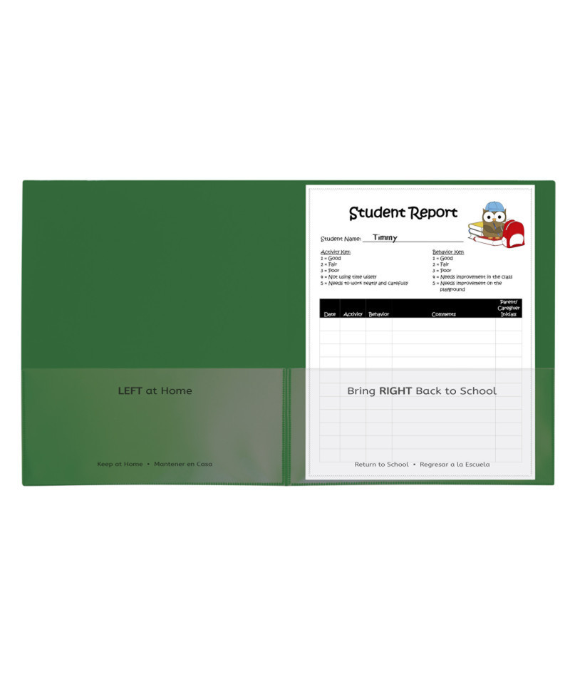 Make the connection between school and home stronger with these school-to-home two-pocket folders. Keep parents and caregivers informed with daily updates on lessons, projects, behavior and more. The interior pockets are imprinted with 'Home' and 'School' designations, in both English and Spanish. Front and back cover pockets are clear, making them great for custom student cover sheets. Made of durable, acid-free polypropylene. Pack of 25. Green.