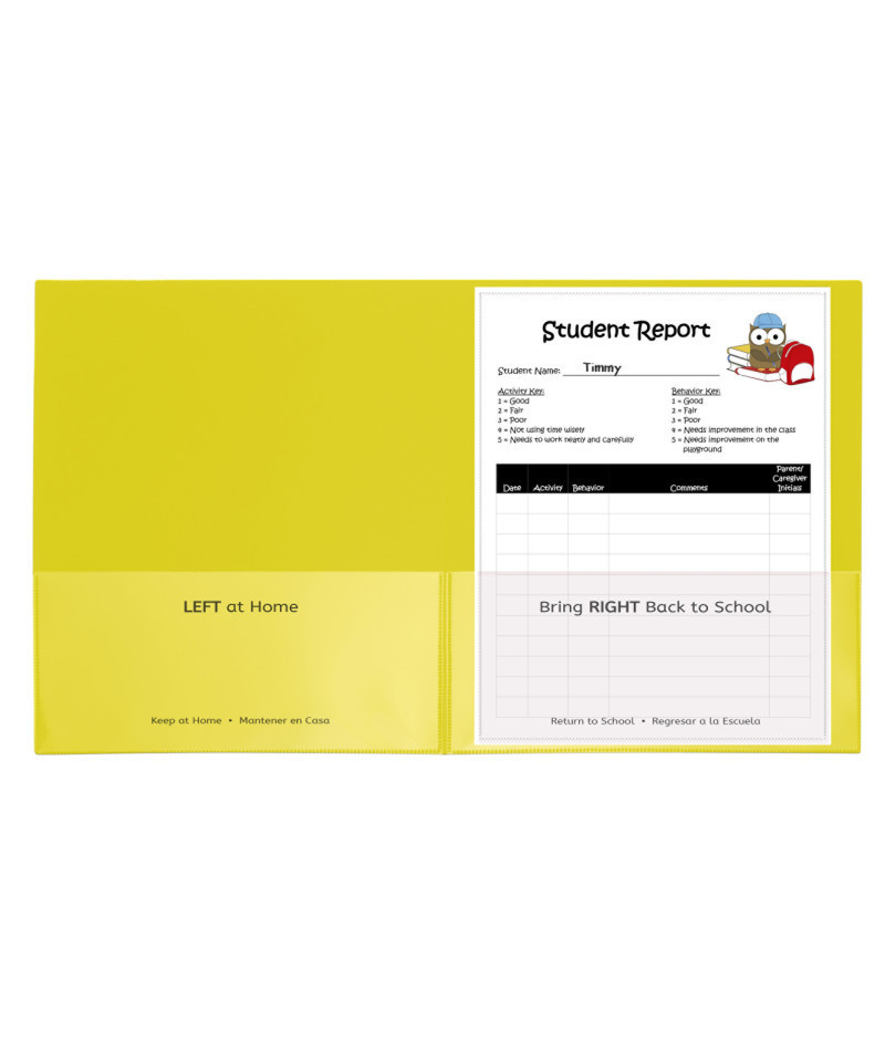 Make the connection between school and home stronger with these school-to-home two-pocket folders. Keep parents and caregivers informed with daily updates on lessons, projects, behavior and more. The interior pockets are imprinted with 'Home' and 'School' designations, in both English and Spanish. Front and back cover pockets are clear, making them great for custom student cover sheets. Made of durable, acid-free polypropylene. Yellow. Box of 25.