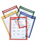 Super Heavyweight Plus Dry Erase Pockets stand up to daily use by students. Easy load design is open on two sides for easier access to worksheets. Colorful cloth binding edge for long-lasting use. Reusable to help to save the environment and paper by eliminating the need to copy worksheets over and over. Convenient eyelet for hanging. Easily cleans with a soft dry cloth or tissue when used with a low-odor dry erase marker or dry erase crayon (not included). Assortment includes 5 each primary colors: red, orange, yellow, green and blue. Insert Size: 9 x 12 or smaller sized papers.