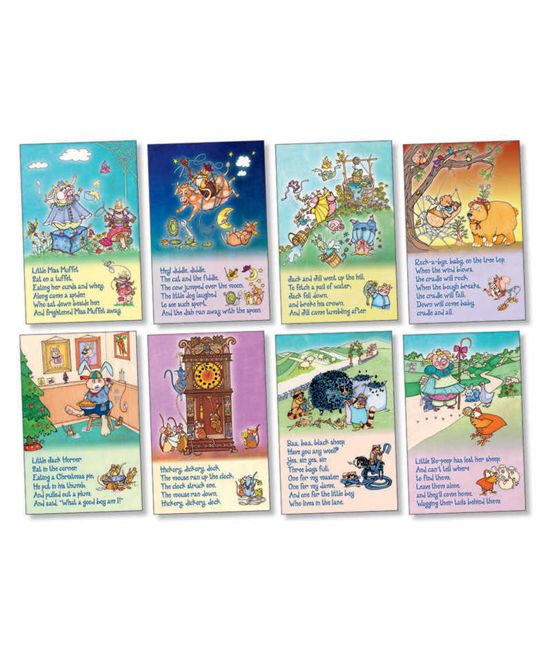 Entertain students with an unexpected twist on favorite nursery rhymes! Colorful illustrations and whimsical animal characters offer a humorous view of eight Mother Goose classics, captivating students and drawing them into the rhythms and rhymes that help build foundational language skills. Each set includes 8 colorful 11" x 17" posters.