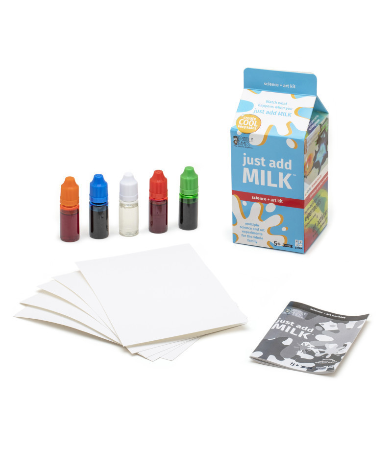 Just Add Milk makes science and art at home easy by using supplies you already have. This kit comes loaded with everything you need for at-home science and art experiments, all you need to do is add the missing ingredient. Just add Milk encourages a curiosity for science combined with a love for experimenting with art. More than 8 science and art activities including Magic Milk, Milk Painting and so much more! Discover Surface Tension, Weakening Molecular Bonds, and Density Of Liquids. This kit features instructions in English, Spanish and French. Designed for kids ages 5 and up.