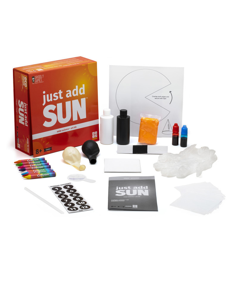 Use the sun's energy to heat up a tasty treat in this solar oven! Melt s'mores, make nachos, or even cook an egg with the power of the sun and the Just Add Sun Solar Science and Art Kit. Learn how solar energy works and introduce kids to eco-friendly energy alternatives. Learn how the energy of the sun can be used for heating objects as well as cooking food. Experiment with sunlight, heat transfer, reflection, and more! Plus learn to 'upcycle' items to create fantastic art! Supplies and complete instructions included. Includes nine experiments and art activities.