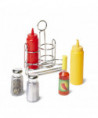 A must-have for the well-appointed play kitchen, these condiments sound and look like the real thing! Packaged in a handy metal caddy to keep everything organized, the six-piece set includes ketchup, mustard, salt, pepper, and hot sauce. Best of all: The salt and pepper really "shake," the hot sauce really "pours," and the ketchup and mustard "squirt" string! These wonderfully durable play pieces are built to last through countless culinary adventures.