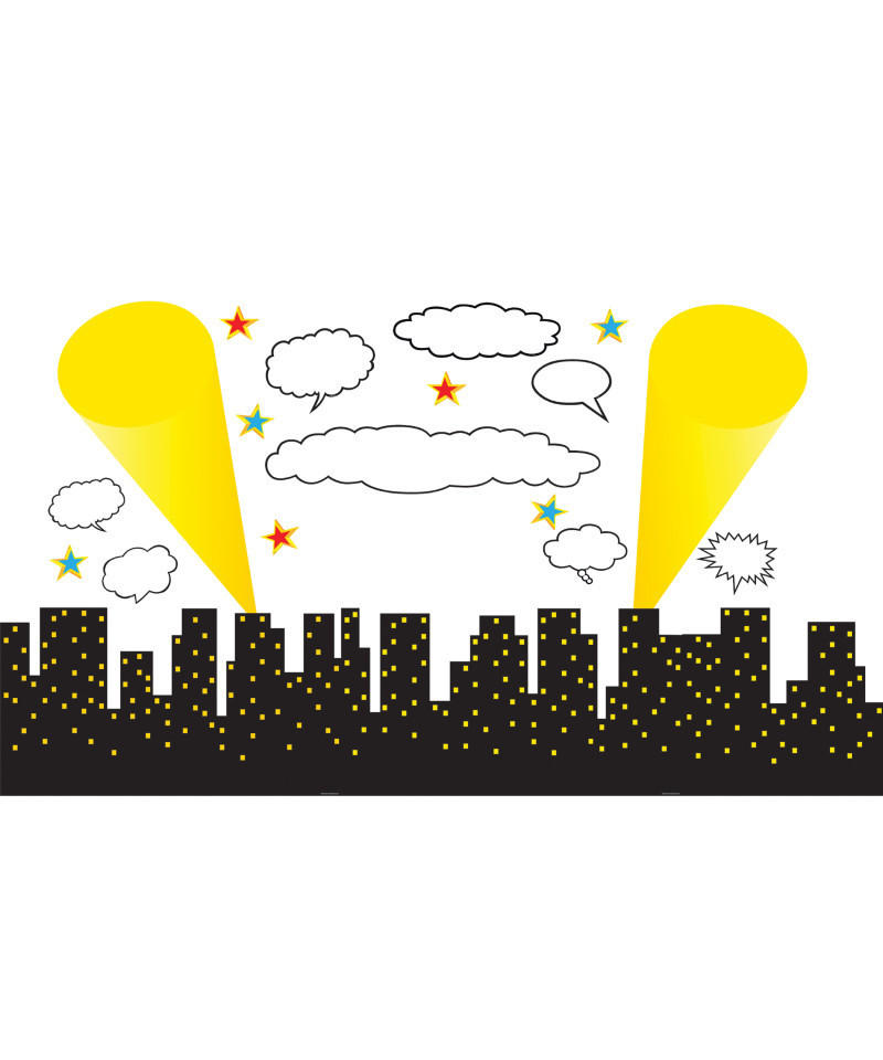 You'll be the superhero when your students see this impressive cityscape scene in your classroom. Each of the 4 building panels is about 24" x 13" and span approximately 8 feet wide when fully assembled. The two spotlight pieces are 2 feet tall. 26 total pieces.
