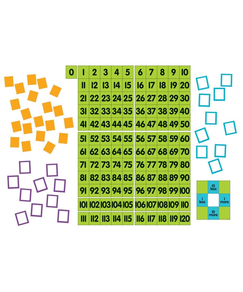 This great tool helps you quickly build a hundred chart on your whiteboard, then build on easily to teach up to 120! And nope, we didn't forget the zero. Big quadrant pieces means no need for time-consuming assembly of many strips. Oversized, bold, colorful, and easy to see (assembled chart measures 24"W x 34"H!). Special t-shaped piece is an effective new tool in popular math programs that helps visualize 1 less and 1 more, and 10 less and 10 more. Dry-erase surface allows for easy circling and easy clean-up. Includes chart pieces, 0 piece, 20 highlighting frames, 20 cover-up squares, and unique t-shaped more/less piece. Ages 6+/Grades 1+.