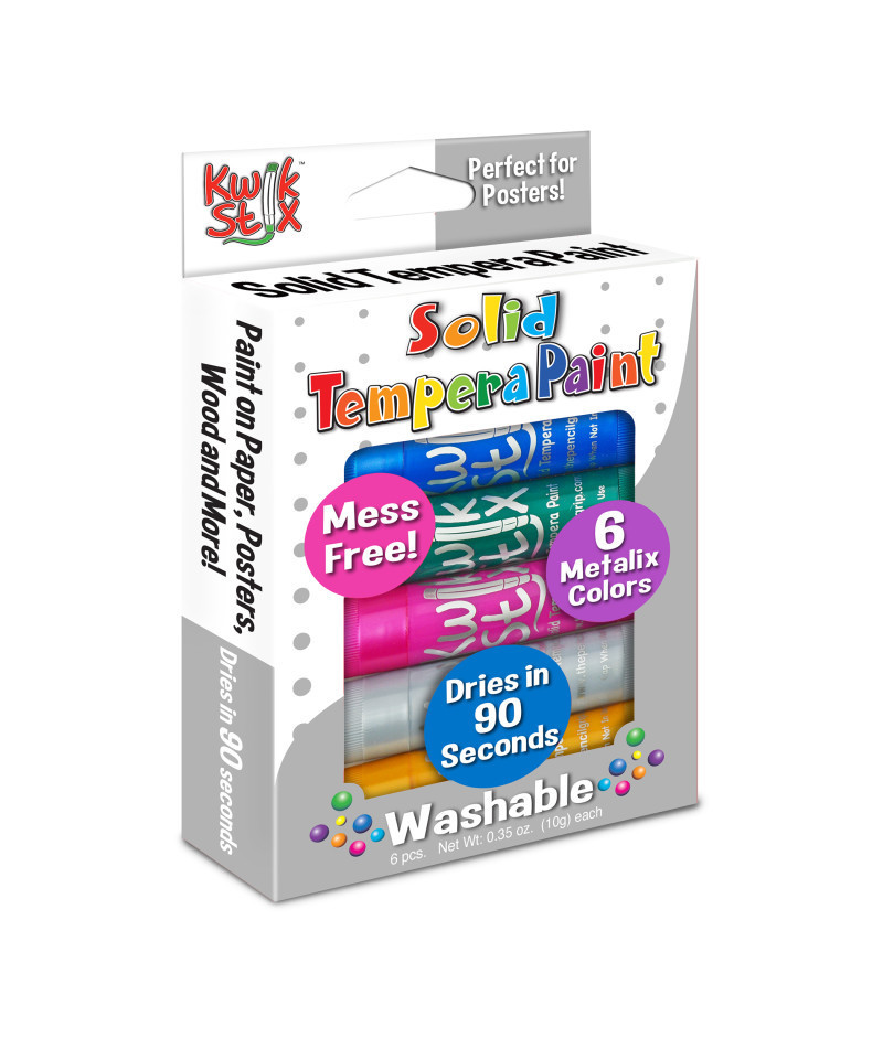 Tired of the endless mess of painting? Fear not! Kwik Stix Solid Tempera Paint sticks take the mess out of painting while keeping all the fun! Simply uncap, twist, and paint! Kwik Stix have a fast drying formula that allow them to dry in 90 seconds while still leaving a paint-like finish! No cups, smocks, water or brushes required. Kwik Stix come in assorted vibrant colors with coverage that won't crack. Great on poster paper, cardboard, wood and canvas. Pack of 6 vibrant metallic colors.