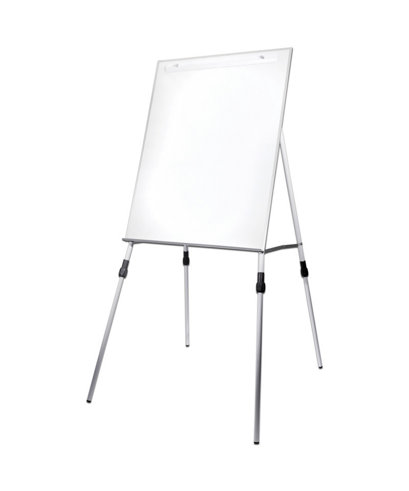 Multi-use, adjustable-height easel offers presentation options you can take anywhere! Sleek 1/2" aluminum frame surrounds a quality, non-ghosting dry erase board. Bottom marker tray spans the entire width and will support posters and large-format books. Locking safety hinges ensure a stability and fold for storage. Steel tubing legs feature anti-skid tips and are height adjustable for use on the floor or table top. Dry erase surface is 27.5" wide x 32" high with a pressure-regulated steel strip along top edge to hold tablets in place with thumb screws. Measures 46" x 5" x 29.5".