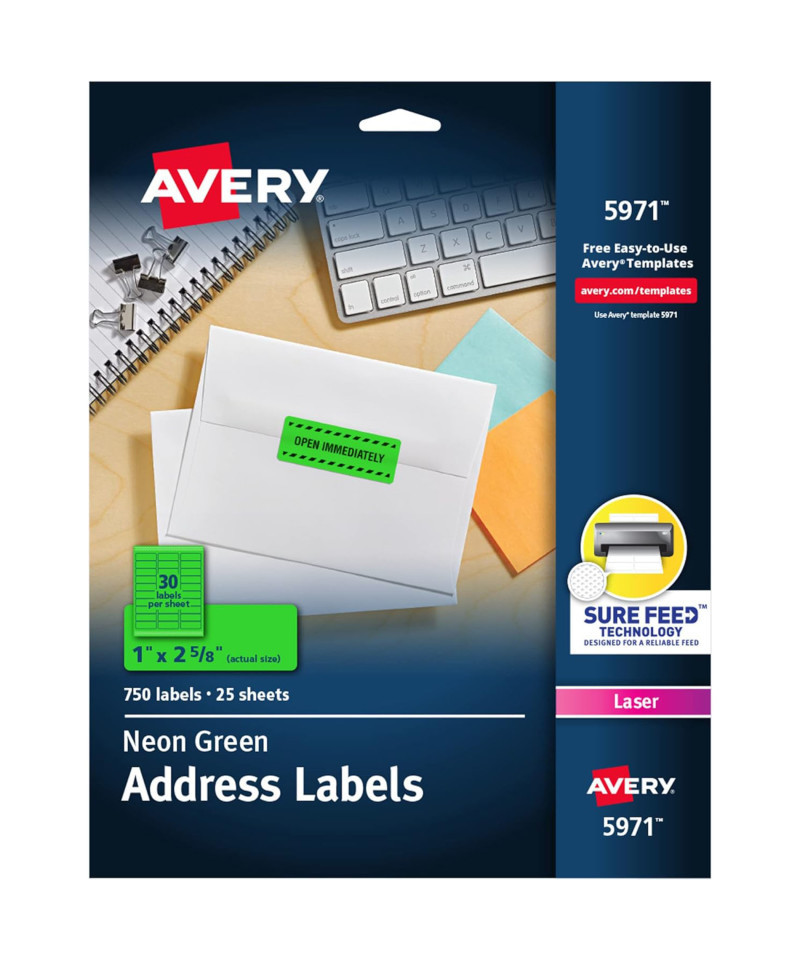 Does you have something bold to say? Then say it loud and clear with these Neon Green High-Visibility Labels. They enable eye-catching colors that will get your advertisement, flier or brochure noticed. And with free templates from avery.com and your laser printer, you can customize the labels with attention-grabbing text and graphics for a powerful message. Labels measure 1" x 2-5/8", permanent adhesive. Includes 750 labels on 25 sheets.