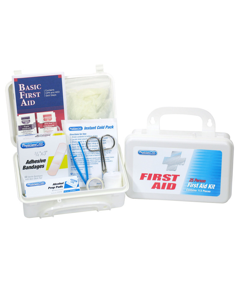 First Aid Kit is the perfect size for your home, office or car. White plastic case is dust and moisture resistant with long-lasting hinges and two latches. A handle is built-in for portability; the kit is also wall mountable. Each kit contains a variety of quality. Products to care for the following: Cuts, Scrapes and Bruises; Minor Eye Irritations; Personal Discomfort; Minor Burns. Includes a First Aid Guide. Meets or Exceeds Federal OSHA Regulation 1910.151b (may vary by state).
