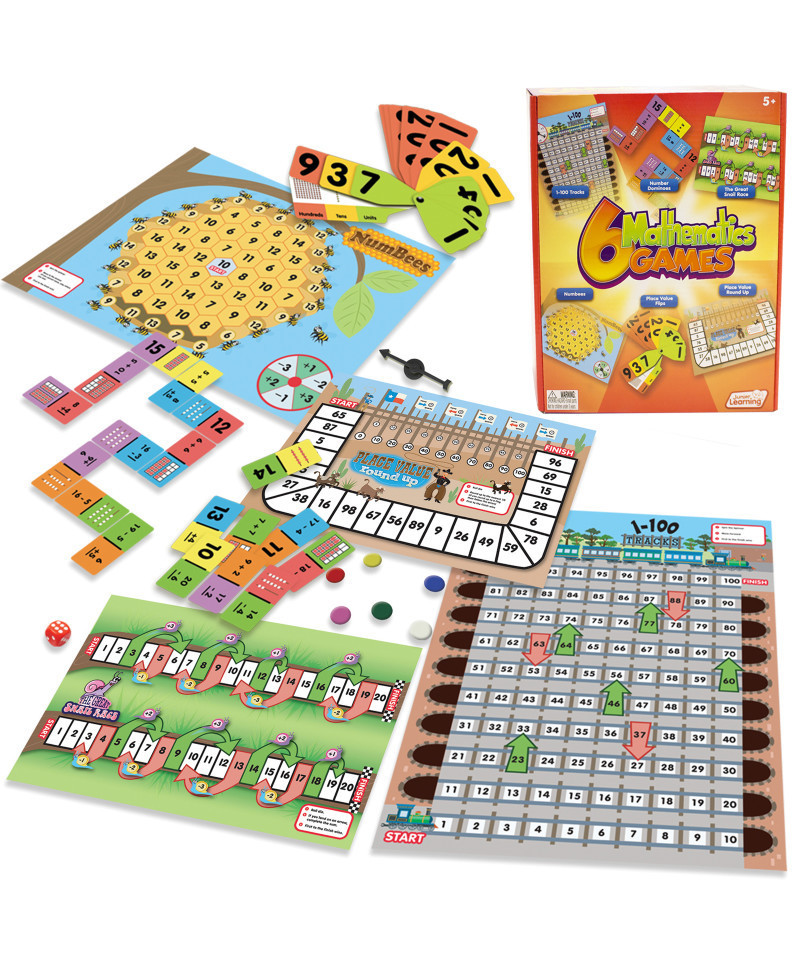 - This value pack of 6 mathematics games contains 4 board games, 18 dominoes, 1 flipper, spinner, die and counters