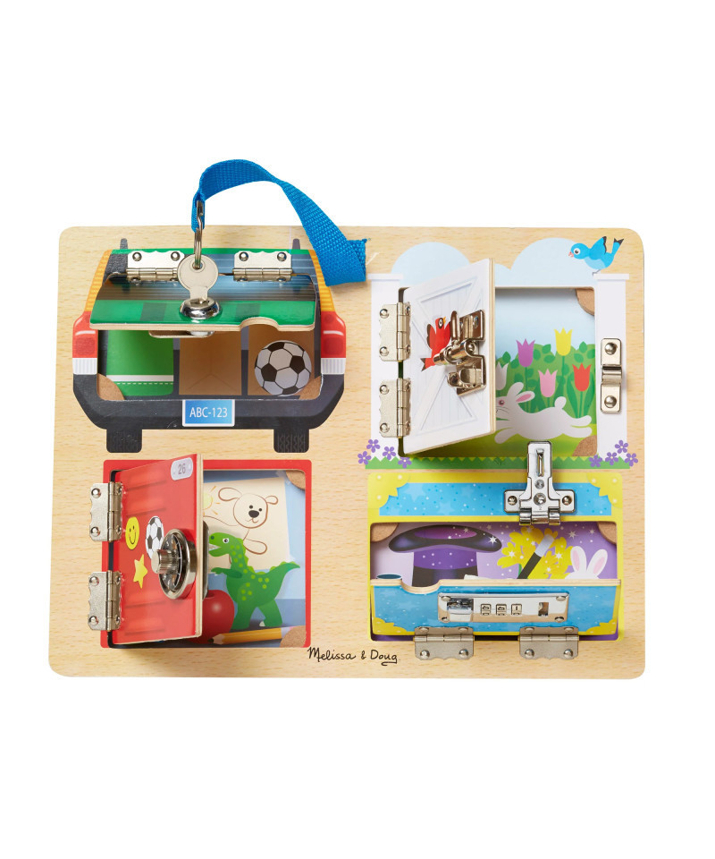 Unlock, unlatch, open the hinged panels, and count on finding fun when the pictures beneath are revealed! Kids will delight in discovering what's hiding behind the locked and latched panels on this wooden play board and educational toy in one. They can seek out a specific picture, race to open and close the doors, or tell a story inspired by what they find. A great way to build fine motor skills and hand-eye coordination while learning colors, numbers, animals, and more!