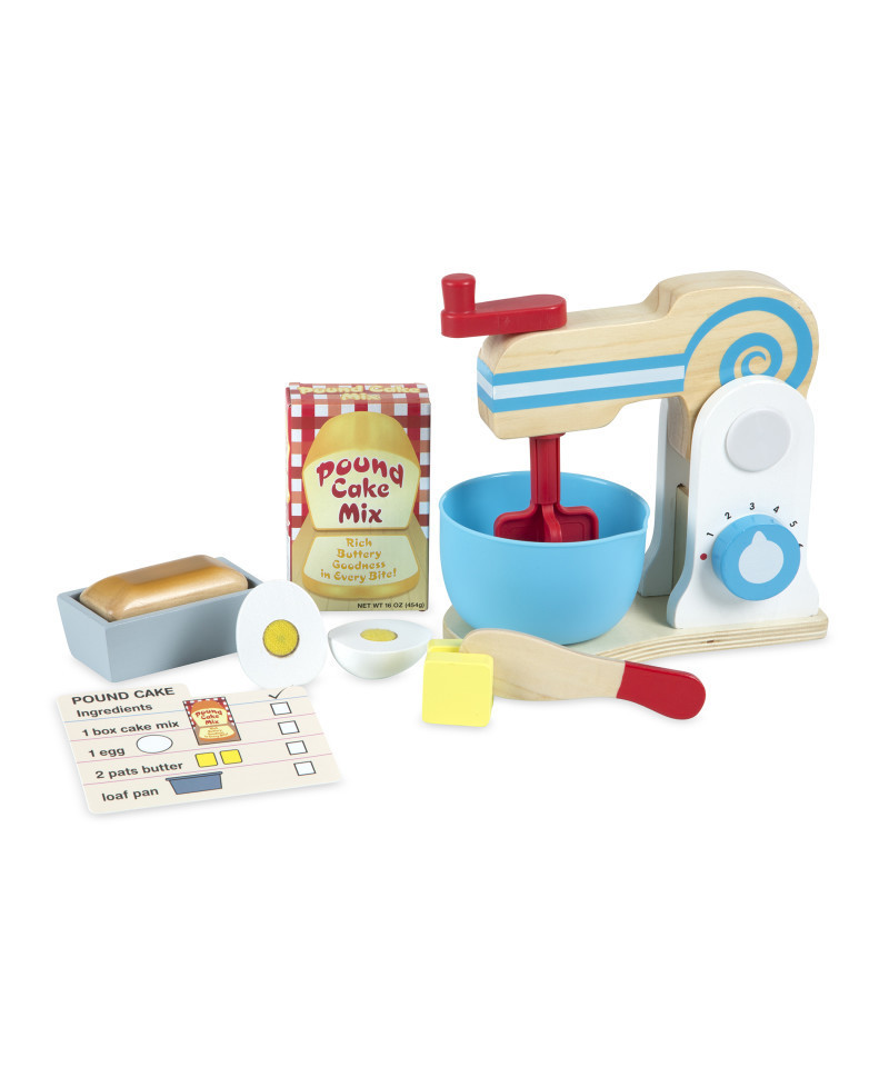 - Includes mixer, bowl, sliceable wooden egg and butter, loaf, cake pan, pretend cake mix box, cake pan, wooden knife, recipe card