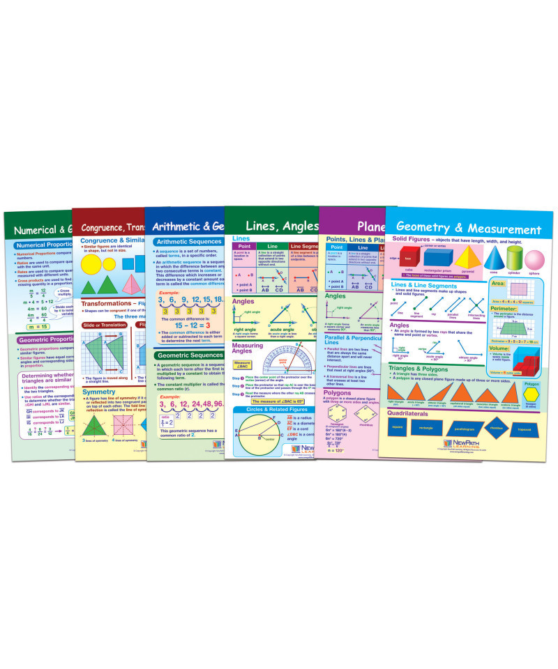 Features a collection of separate posters, each covering a separate, curriculum topic. Uniquely designed, while one side can be posted for student reference, the reverse features dry-erase activities perfect for individual student review or as a learning center activities! Graphic images and hands-on activities combine to provide comprehensive coverage of essential student skills and cover the current state and national standards — including Common Core! Each 12" x 18" Chart is laminated and double-sided — Side 1 features a graphic overview of the topic and Side 2 provides "write-on/wipe-off" activities. Covers Geometry & Measurement; Lines, Angles & Circles; Congruence, Transformation & Symmetry; Plane Geometry; Arithmetic & Geometric Sequences; and Numerical & Geometric Proportions.