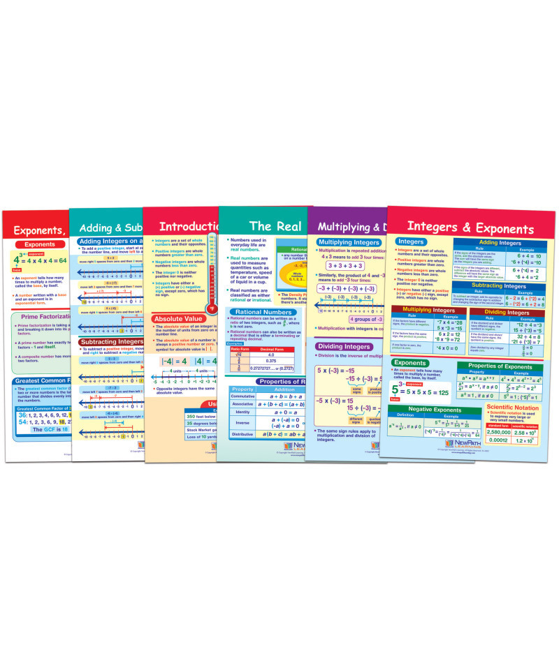 Features a collection of separate posters, each covering a separate, curriculum topic. Uniquely designed, while one side can be posted for student reference, the reverse features dry-erase activities perfect for individual student review or as a learning center activities! Graphic images and hands-on activities combine to provide comprehensive coverage of essential student skills and cover the current state and national standards — including Common Core! Each 12" x 18" Chart is laminated and double-sided — Side 1 features a graphic overview of the topic and Side 2 provides "write-on/wipe-off" activities. Covers Introduction to Integers; Adding & Subtracting Integers; Multiplying & Dividing Integers; Integers & Exponents; The Real Numbers; and Exponents, Factors & Multiples