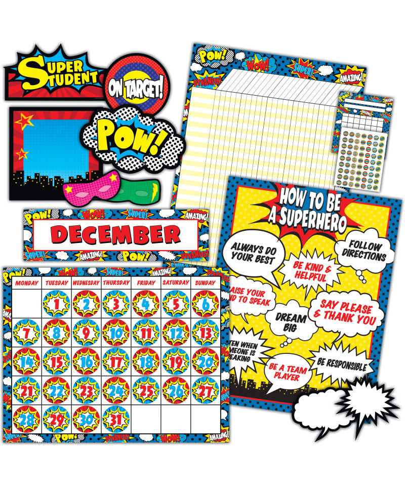 Decorating your classroom is a snap with our Superhero Classroom Set. The set includes 30 accents, a 52 piece bulletin board, 3 charts each 17" x 22", 12 monthly headliners, 36 calendar days, and 1144 mini stickers.
