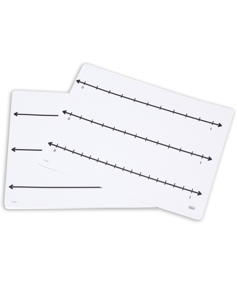 Three number lines marked in 16ths, 10ths, and 12ths on one side and three open number lines on the other. Mats are 9" x 12", made of durable flexible plastic. For use with dry-erase markers. Set of 10.
