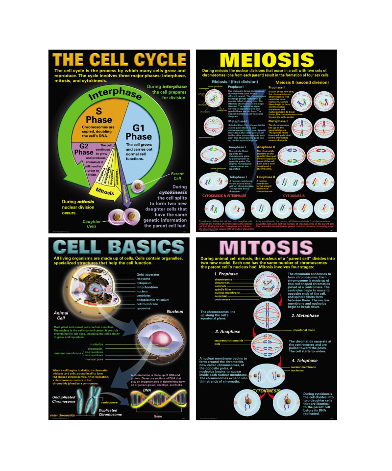 Help students learn about the “building blocks” of life with these posters that teach the main parts of a cell and the phases of the cell cycle. The posters also clearly describe and illustrate the stages of mitosis and meiosis. Includes 4 posters. Each poster measures 17" x 22".
