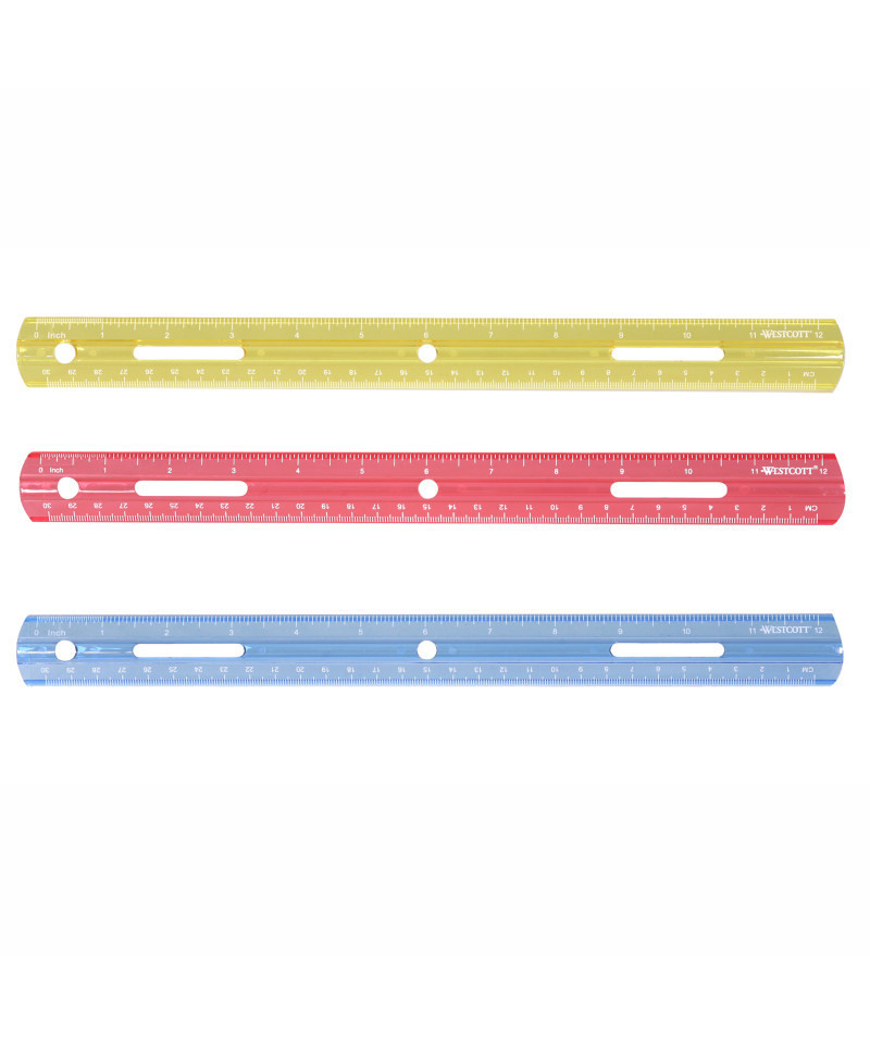 Westcott Drafting & Drawing Tools are some of the finest products of their kind for students and professionals. Our commitment to meticulous quality and cutting edge innovation in measurement and art materials has earned an unparalleled reputation. Durable plastic ruler is ideal for students. Beveled edge acts as an excellent drawing and drafting guide. Standard and metric markings simplify measurement tasks. Convenient two and three ring binder slots enable easy storage. Imperial (English)/Metric measurement system. 1/16" and metric scales. Assorted: Red, Yellow, and Blue (color can't be specified when ordered). 12".