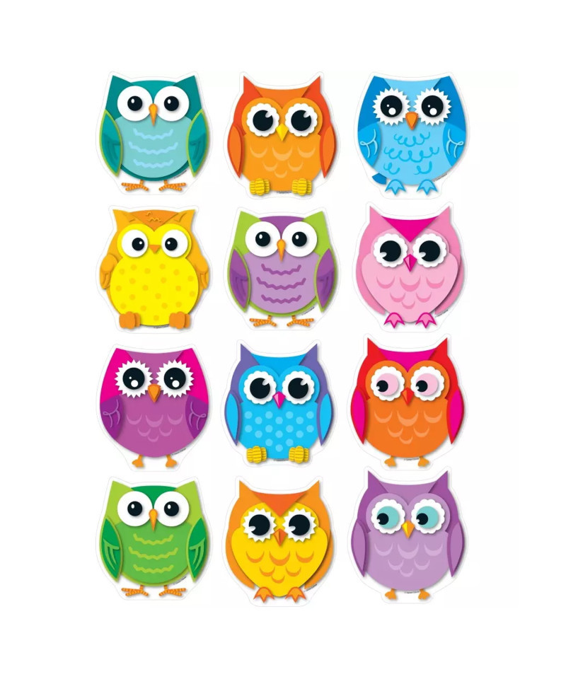 Whooo doesn't love owls? Enhance the look and functionality of your classroom with cut-outs! Each pack includes 36 brightly colored owl cut-outs printed on sturdy card stock, and come in 12 assorted designs and colors.