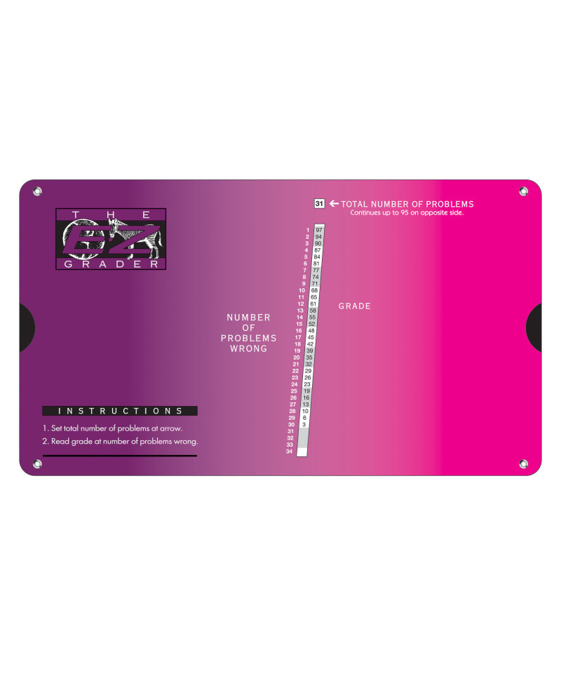 This slidechart is the same size as our popular "Original, Pink or Purple", but is done in a beautiful graduated color. This Ombre chart starts with Byzantine, which is a rich tone of purple toned towards Magenta. Scores any number of questions up to 95, with up to 34 incorrect. Actual size is 8.5" x 4.75". Saves time and effort when grading homework, tests or quizzes.