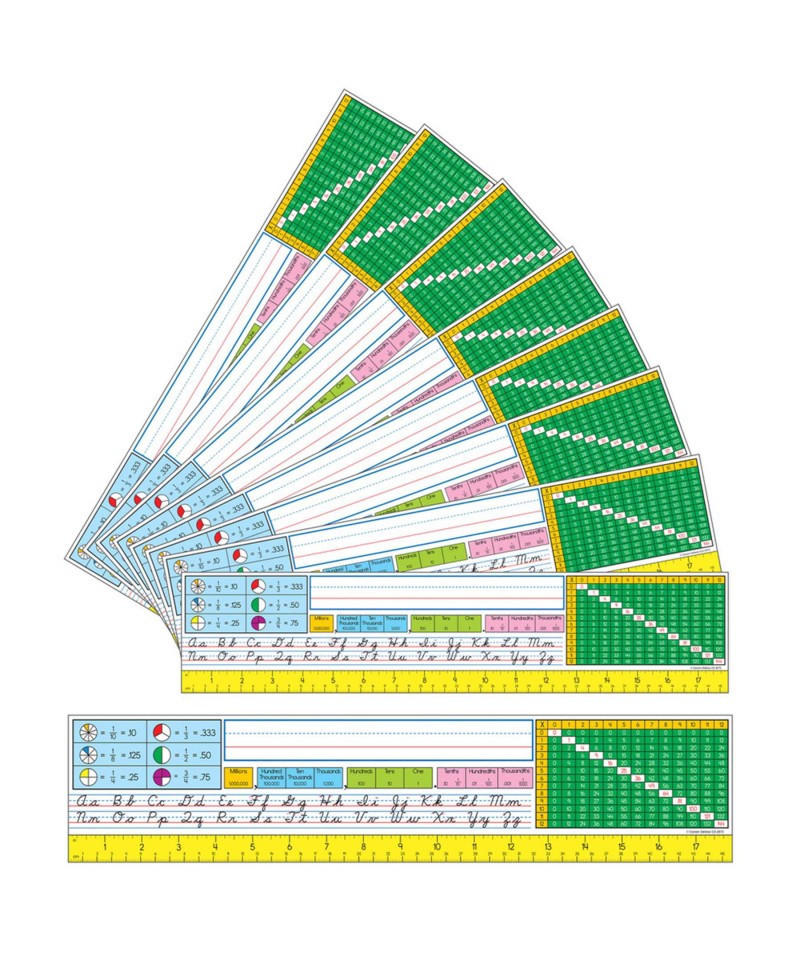 These Modern Cursive nameplates include a name line; modern cursive alphabet (uppercase and lowercase) with stroke lines; 0-12 multiplication table; place value chart with words, fractions, and numerals; fraction and decimal equivalents; and standard and metric rulers. Each nameplate is 18" x 4" and each pack includes 36 nameplates.