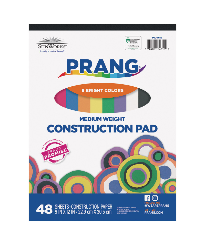 Prang® Medium Weight Groundwood Construction Paper Pad features 8 assorted colors: Scarlet, Orange, Blue, Violet, Green, Yellow, Black, and White. It is perfect for beginner arts & crafts. Great for both home and school use and is portable. Recyclable. Measures 9" x 12". Each pad includes 48 sheets.