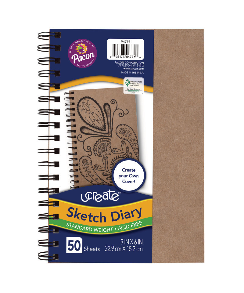Sturdy Natural Kraft chipboard cover and back make this versatile sketch diary fun to decorate and personalize with metallic pens, markers and gel pens. Standard weight White drawing paper inside is perfect for teens, students and young adults. Acid free. Recyclable. Measures 9" x 6". Includes 50 sheets.