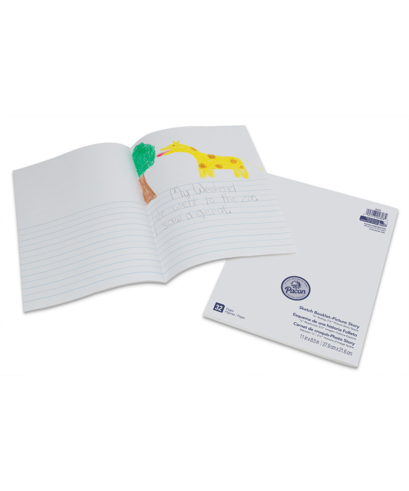 Economical sketch booklets are perfect for early childhood and elementary journaling, as well as interactive note taking. Stay bright White paper is ideal for dry media. These Booklets are ruled with a 7/8" ruling and a 5-1/8" picture story space on the top. Sheets are bound with a stapled binding. The blank cover allows each student to personalize their own booklet. Acid-free and recyclable. Measures 8.5" x 11". Includes 16 sheets.