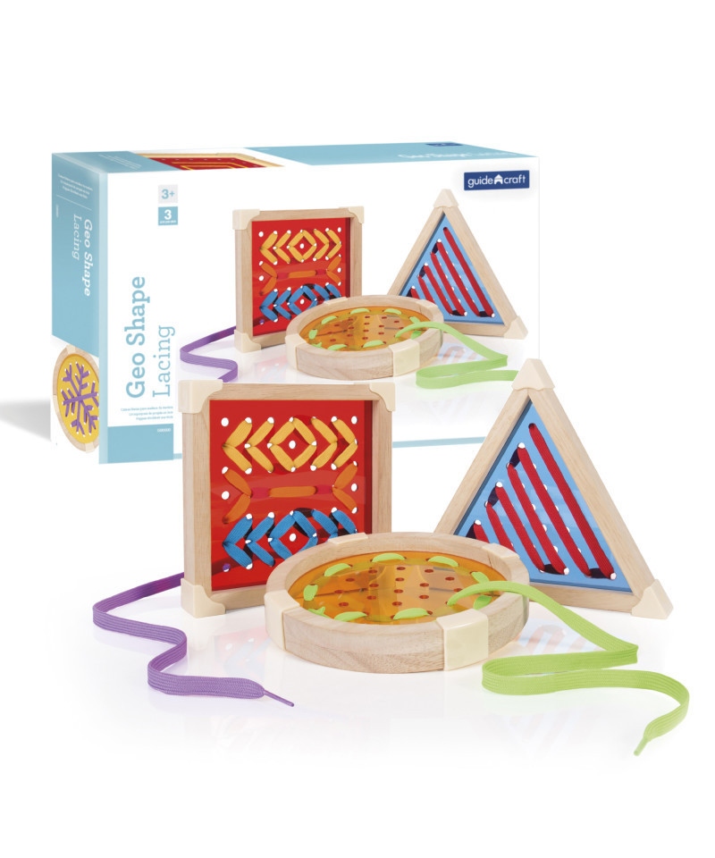 - Geo Shape Lacing is a colorful, geometric new look for a classic lacing activity toy
