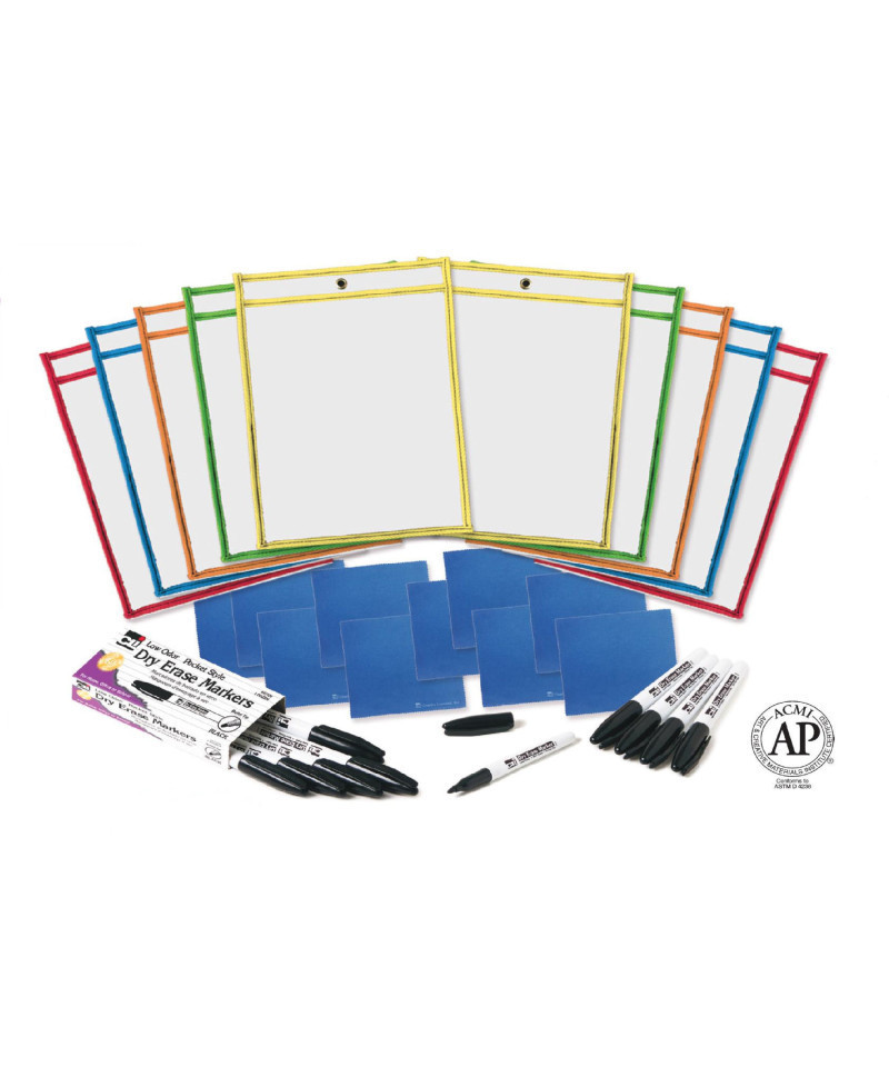 This convenient class pack is ideal for all classrooms and daycares. Save paper and money with this set as it allows you to re-use the same sheets over and over. Class Pack includes 10 Pockets, Dry Erase Markers and Multi-purpose cloth erasers. Pockets feature a side panel opening that allows you to easily insert and remove standard size papers. The dry erase markers included are Pocket style with bullet tips in black and are AP certified and conform to ASTM D4236. Also included are our multi-purpose cloths that can be used on all surfaces. Cloths can be washed and re-used for an extra long life. Assorted Primary colors.