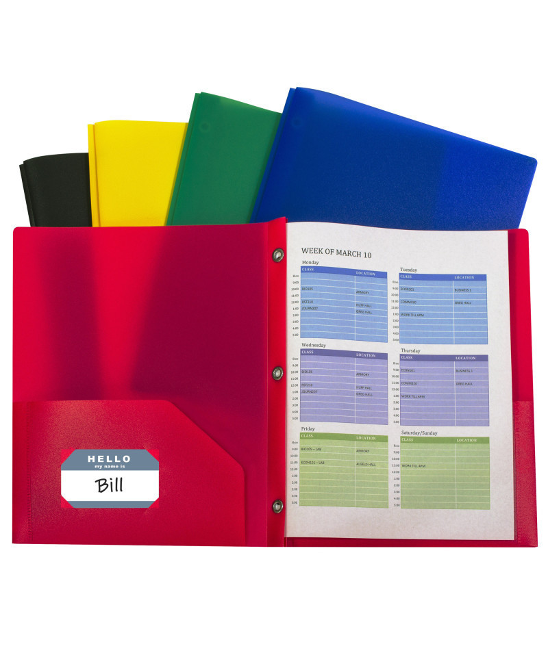 Ideal for classroom and office settings, two-pocket folders are an essential presentation and document storage item. Keep track of 8-1/2 x 11 size documents by organizing them in these durable portfolios. Two-pocket heavyweight polypropylene folders hold papers and resist tearing. Features business card slot. With prongs. The vibrant colors help identify and differentiate information being stored for a particular class or project. Assortment includes 2 each of red, yellow, green, blue and black folders. Pack of 10.