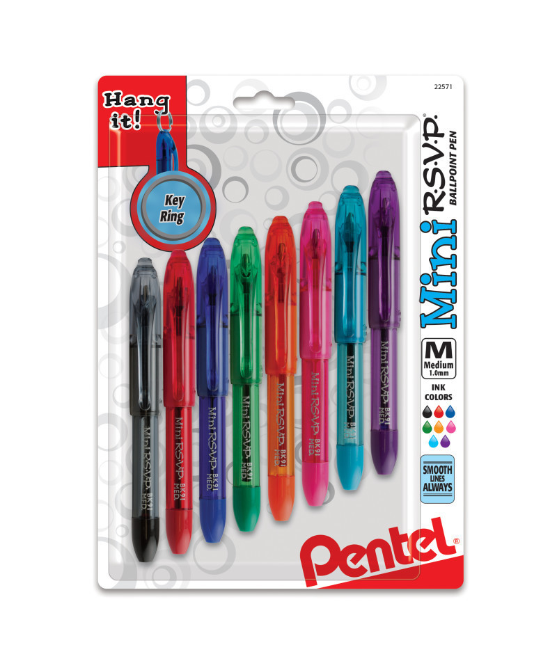 Never lose your pen again! Attach your Mini RSVP to a lanyard, backpack, small notebooks, pockets, purses and more. Writes smooth medium lines. Comfort Zone™ latex free grip. Each pack includes 8 pens in ink colors with brightly colored barrels – ink matches barrel color.