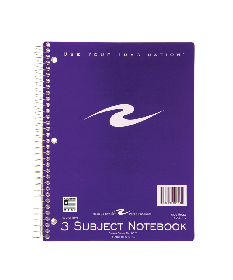Three subject wirebound notebook. Smooth, white, 15lb writing paper is wide ruled with a red margin line. Covers are printed on bright board in 4 assorted colors (no color choice). Wire ends are coil-locked for snag-proof performance. Each book is 10.5" x 8" and contains 120 sheets of writing paper, along with 2 subject dividers. 24 books per case. Proudly made in USA!
