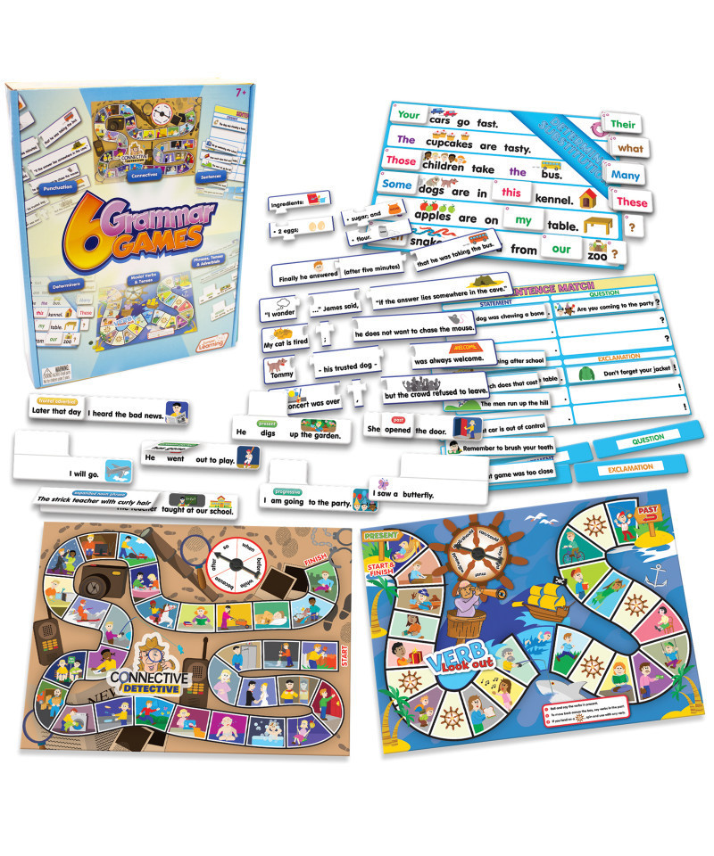 This set of educational games and activities is designed to teach an understanding of grammar. Topics include: punctuation, connectives, sentences, determiners, modal verbs, tenses, phrases and adverbials. This value pack contains 2 board games, 2 matching games, 14 sentence puzzles, die, spinner and counters. Contains a game guide with instructions. Ages 7+.